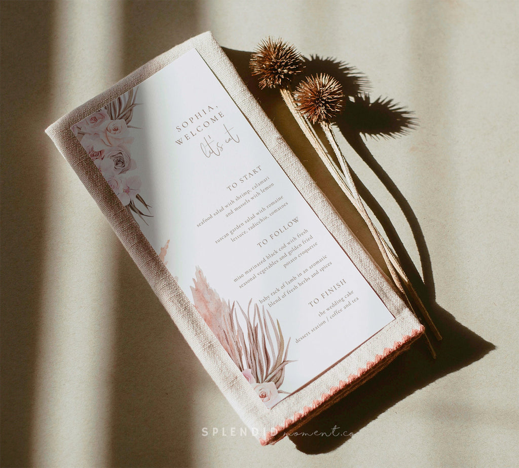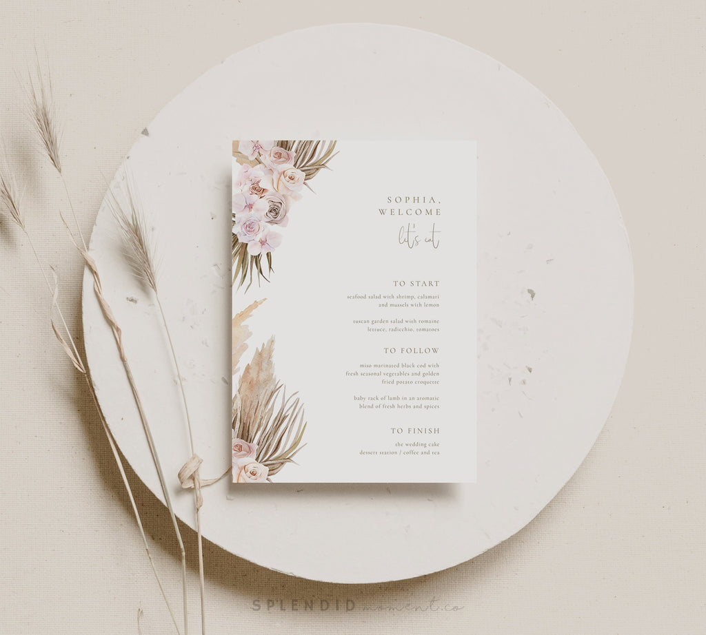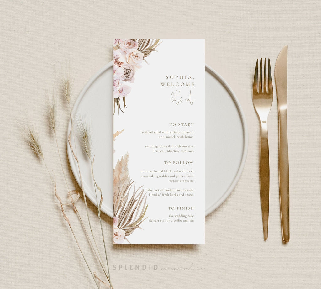 Highlighting the guest's name in a modern font, this floral pampas grass wedding menu template is romantic and bohemian. Looks beautiful on neutral or white cardstock.