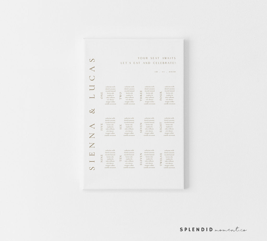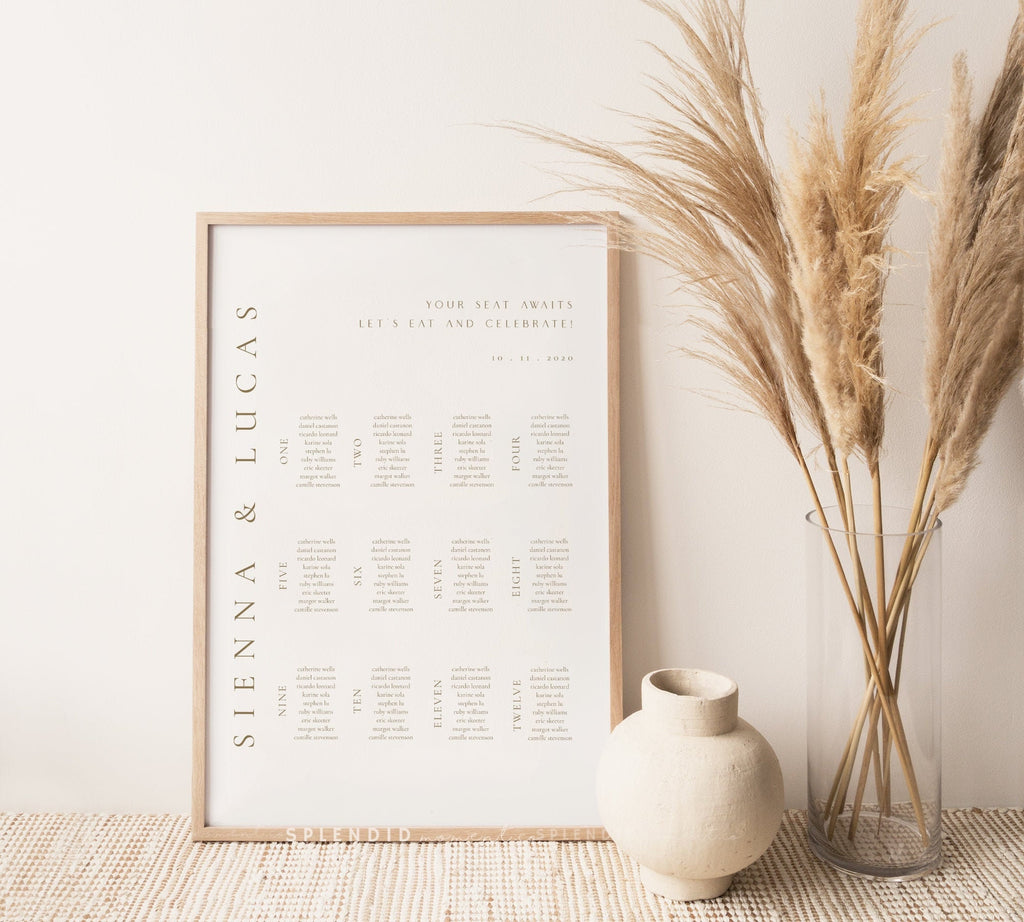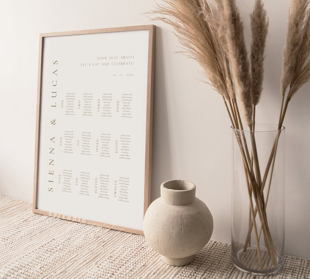 This modern wedding seating chart template features an eye-catching font and table layout. Perfect for a modern neutral-themed wedding! It's also stunning as part of a bohemian wedding. Edit the font color and background color to match your event theme!